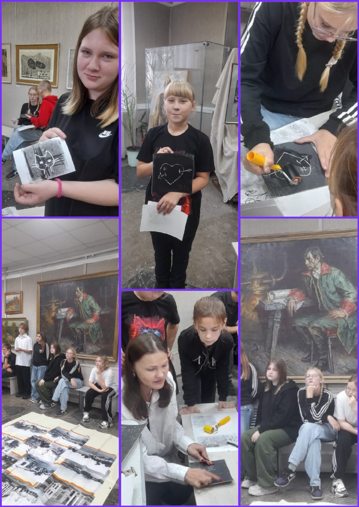 Сегодня наши ребята посетили картинную галерею им. Г.Ф. Борунова, где экскурсовод Юлия Цыганова рассказала о старом Павловске и сегодняшнем. Также о Г.Ф.Борунове, об истории возникновения картинной галереи, о редких полотнах, имеющихся здесь. Затем, ребята узнали о редком и новом виде живописи - линогравюре - искусстверисования на линолеуме. С помощью необычного режущего инструмента - штихера создаются рисунки, затем, тщательно покрытые черной краской оттискиваются на плотной бумаге. Ребят очень заинтересовала техника линогравюры. Всё с интересом включились в этот очень сложный и кропотливый процесс. Многие копировали уже готовые рисунки, а кто-то создавал свои, авторские. Получив огромное удовольствие от результатов, ребята свои работы оставили себе на память.